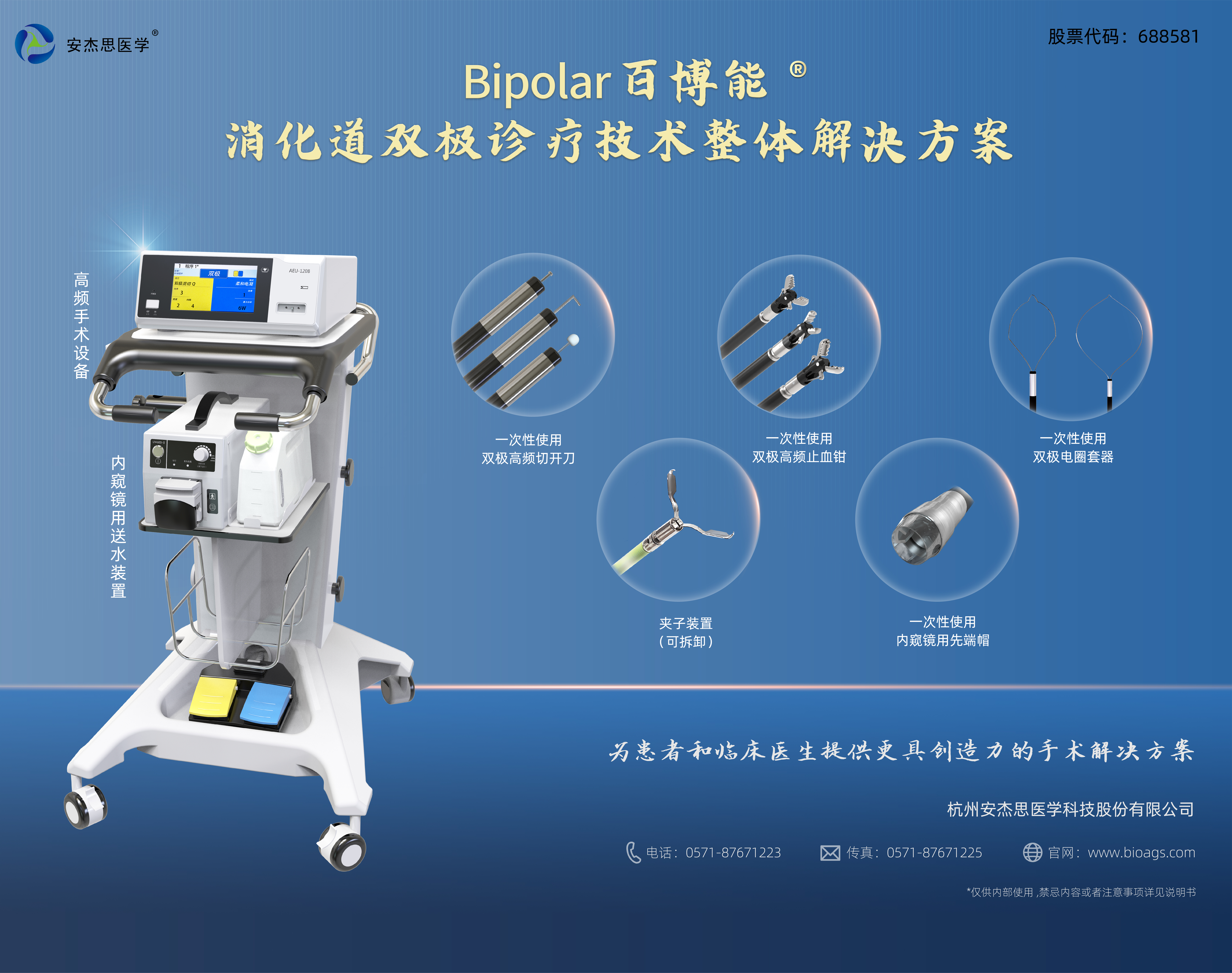其中由复旦大学附属中山医院张轶群教授,使用安杰思医学Bipolar百博能®双极电刀系统行一例胃体+胃窦ESD的手术演示,双极电刀系统以其无需粘贴负极板、切割效率高、止血效果佳、组织深层热损伤浅不易穿孔等优势,获得了与会专家学者的高度认可。
